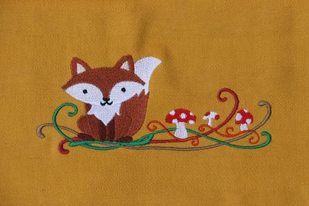 Keukenhanddoek en theedoek okergeel met vos en paddestoeltjes