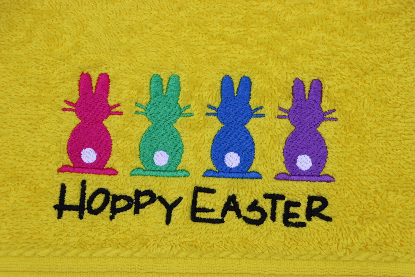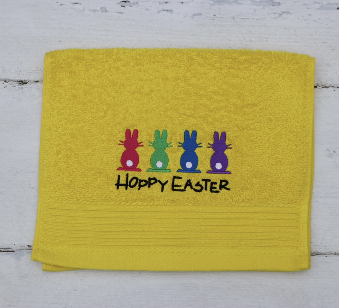 Gastendoekje geel met gekleurde haasjes en Hoppy Easter