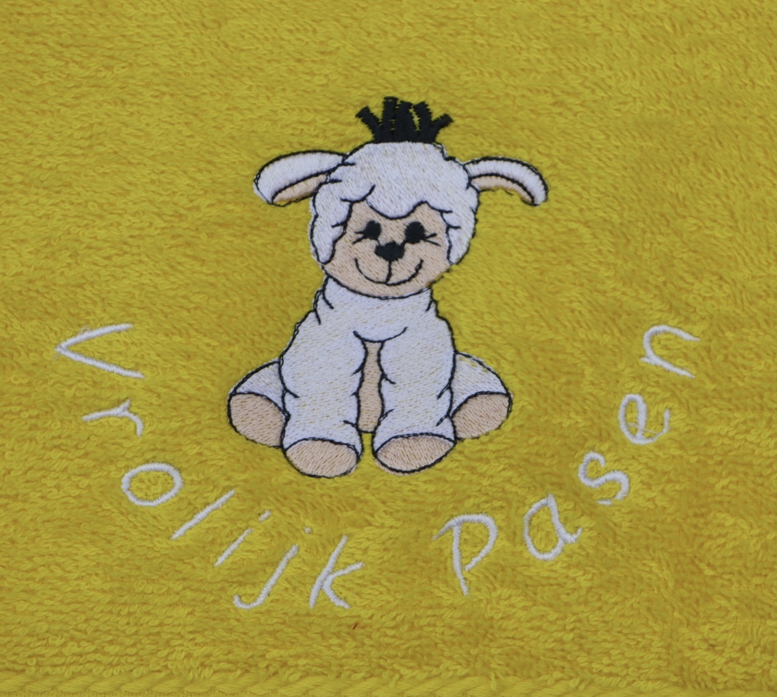 Gastendoekje geel met lammetje en Vrolijk Pasen aantal