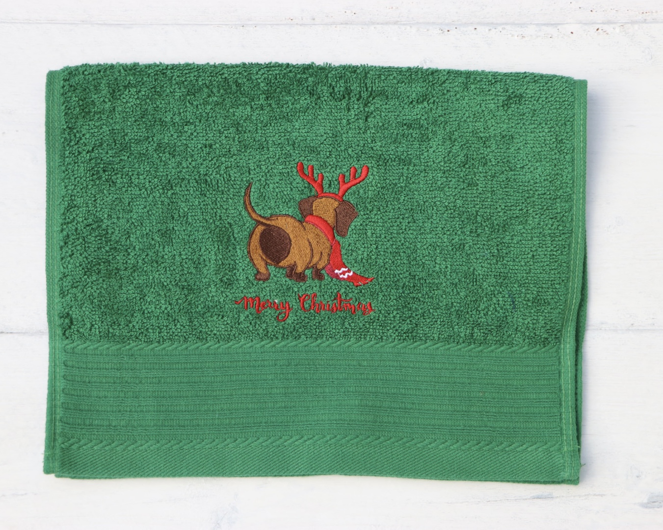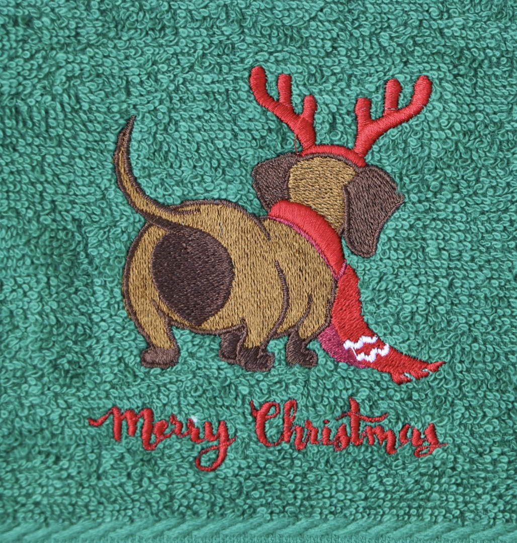 Keukenhanddoek en theedoek groen met een kerst teckel kontje
