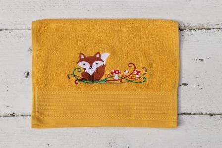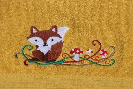 Gastendoekje in warm-geel met een vos en paddenstoelen aantal