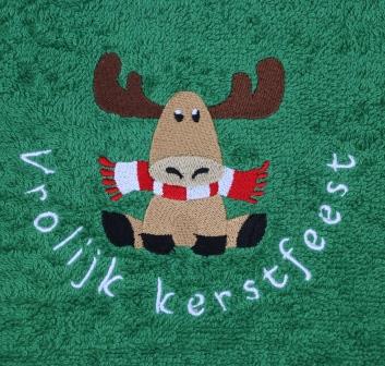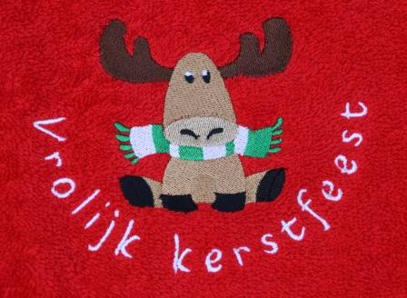 Gastendoekjes rood of groen met een eland met sjaal en tekst Vrolijk kerstfeest