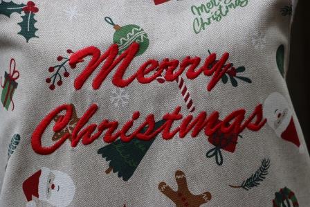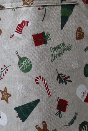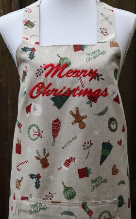 Kerst keukenschort met kerstballen, sokken, kerstman,cadeautjes en de tekst Merry Christmas aantal