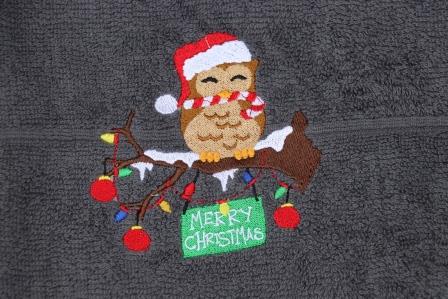 Keukenhanddoek en theedoek donkergrijs met uiltje op kerst-tak en Merry Christmas aantal