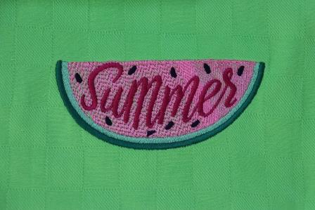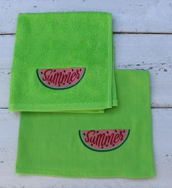 Keukenhanddoek en theedoek grasgroen met een “Summer” watermeloen