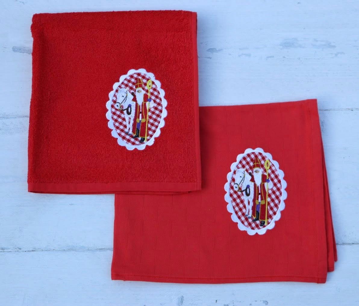 Keukenhanddoek en theedoek rood met applicatie van Sint aantal