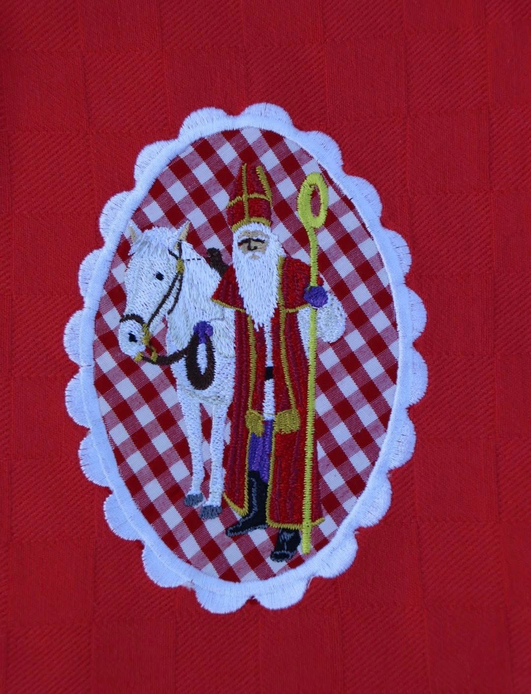 sintdiversenKeukenhanddoek en theedoek rood met applicatie van Sint