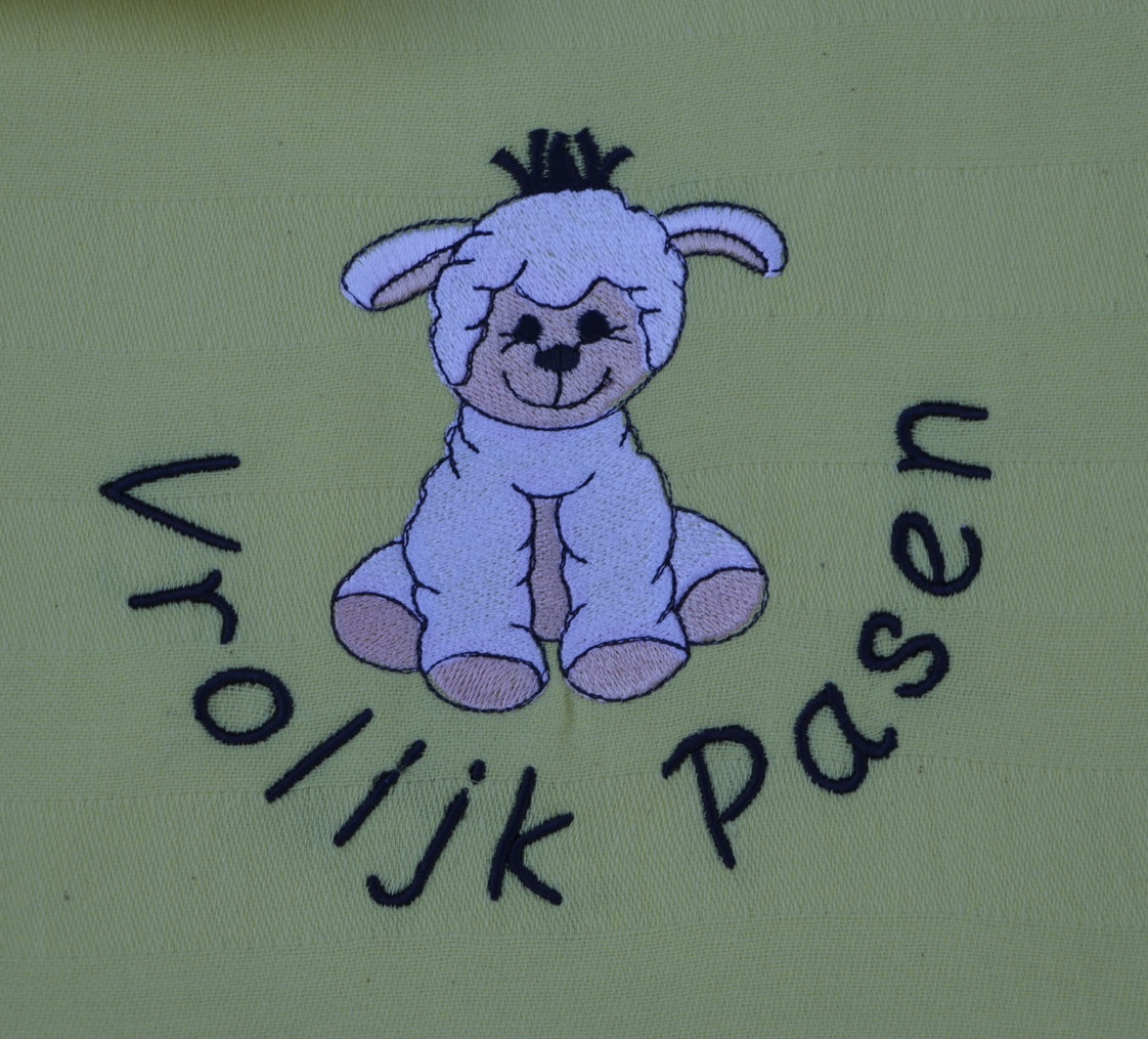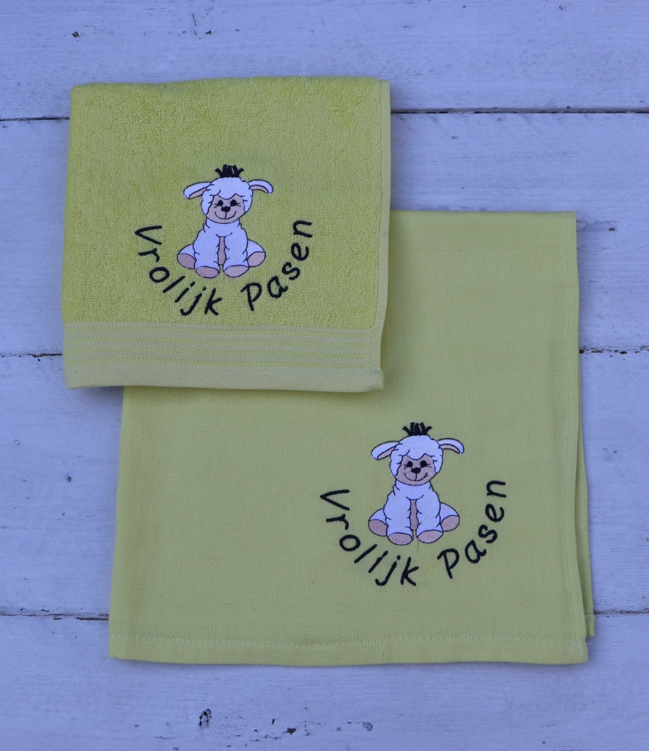Keukenhanddoek en theedoek zachtgeel met lammetje en Vrolijk Pasen