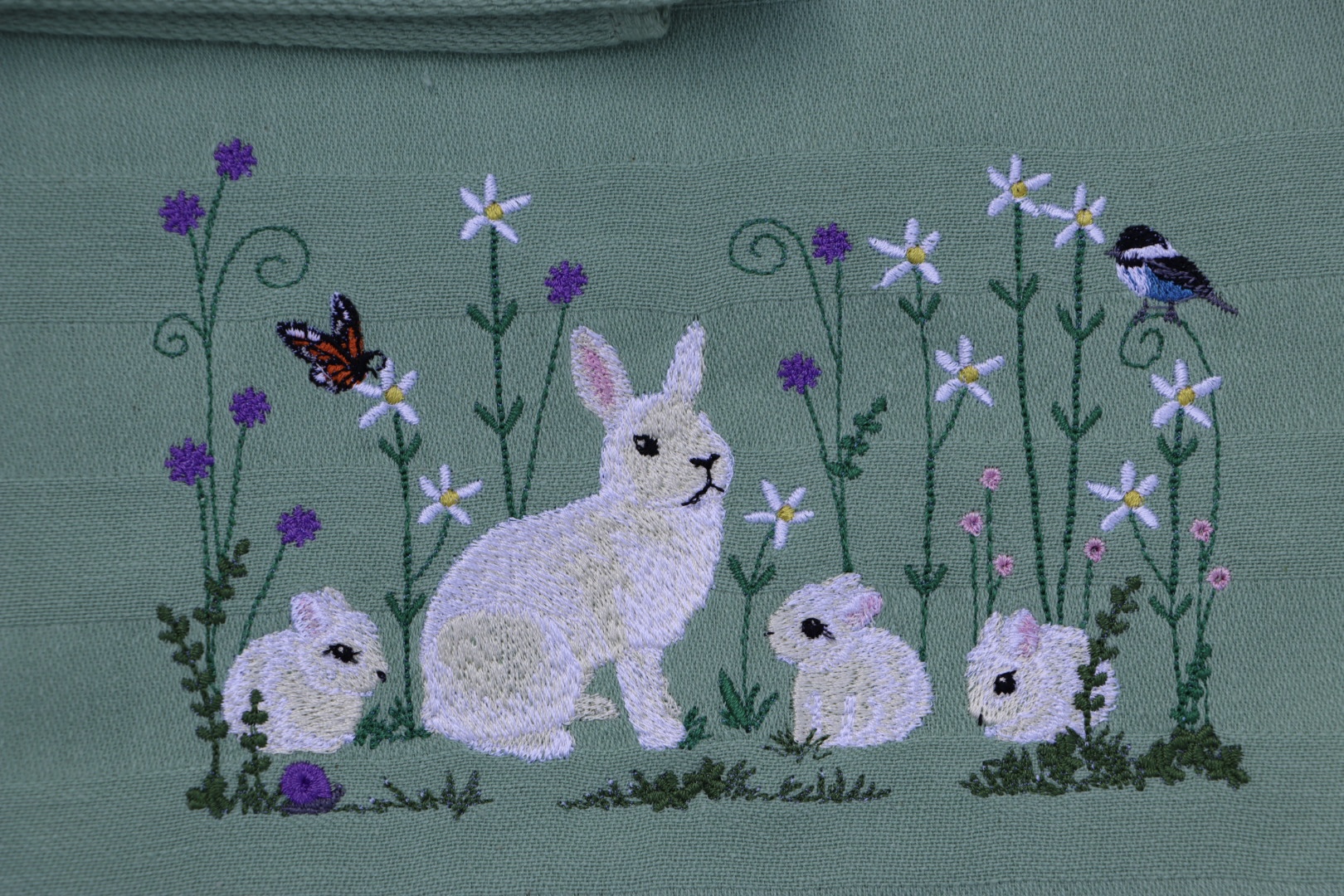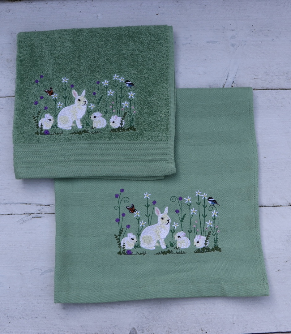 Keukenhanddoek en theedoek zachtgroen met konijntjes in een bloemenveld