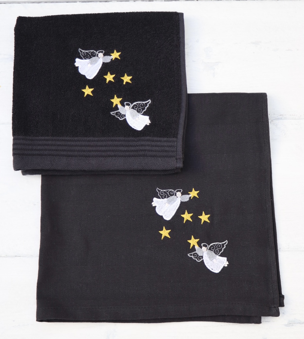 Keukenhanddoek en theedoek zwart met engelen en sterren