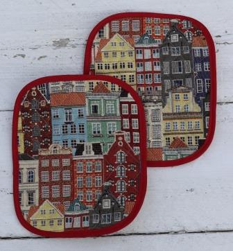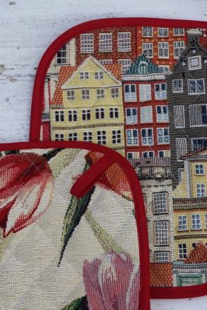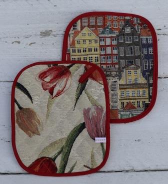Pannenlappen van stevige Gobelin stof met Hollandse gevelhuisjes en tulpen