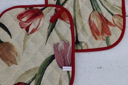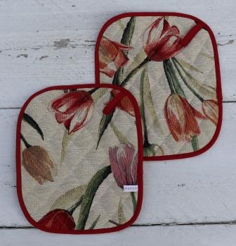 Pannenlappen van stevige Gobelin stof met Hollandse gevelhuisjes en tulpen aantal